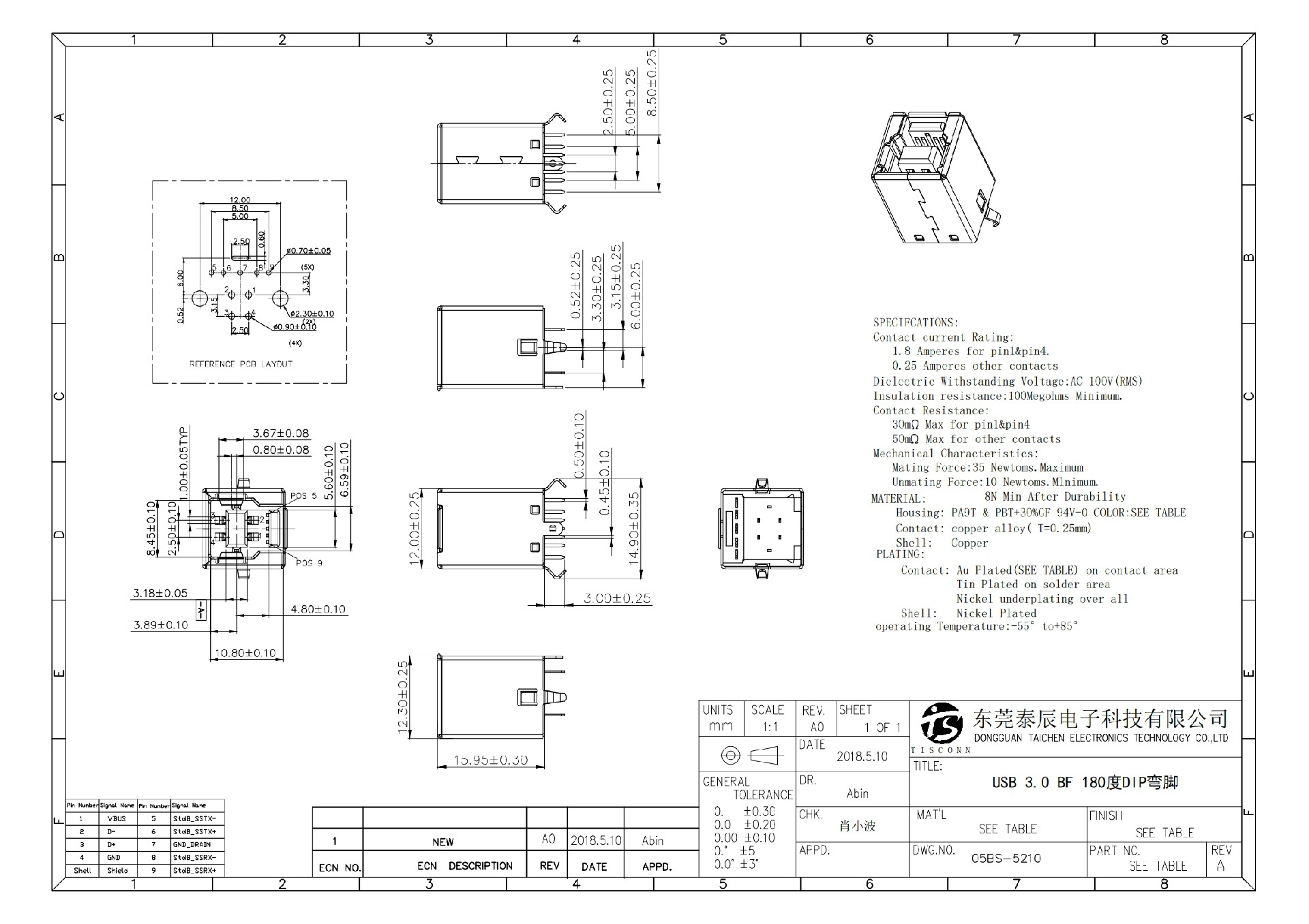 05BS-5210 USB 3.0 BF 180度DIP彎腳 藍(lán)膠銅殼