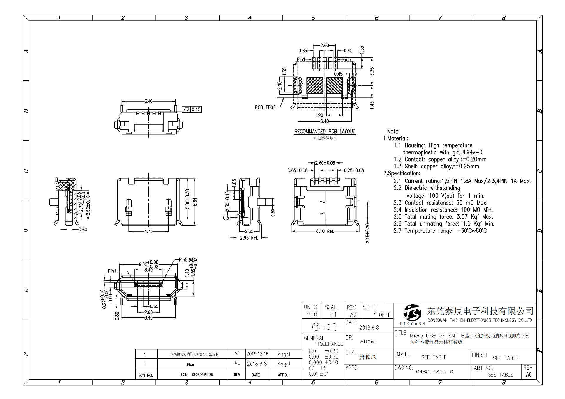 04BO-1803-0 Micro USB 5F SMT B型90度插板兩腳6.40腳高0.8短針不帶焊盤無柱有卷邊