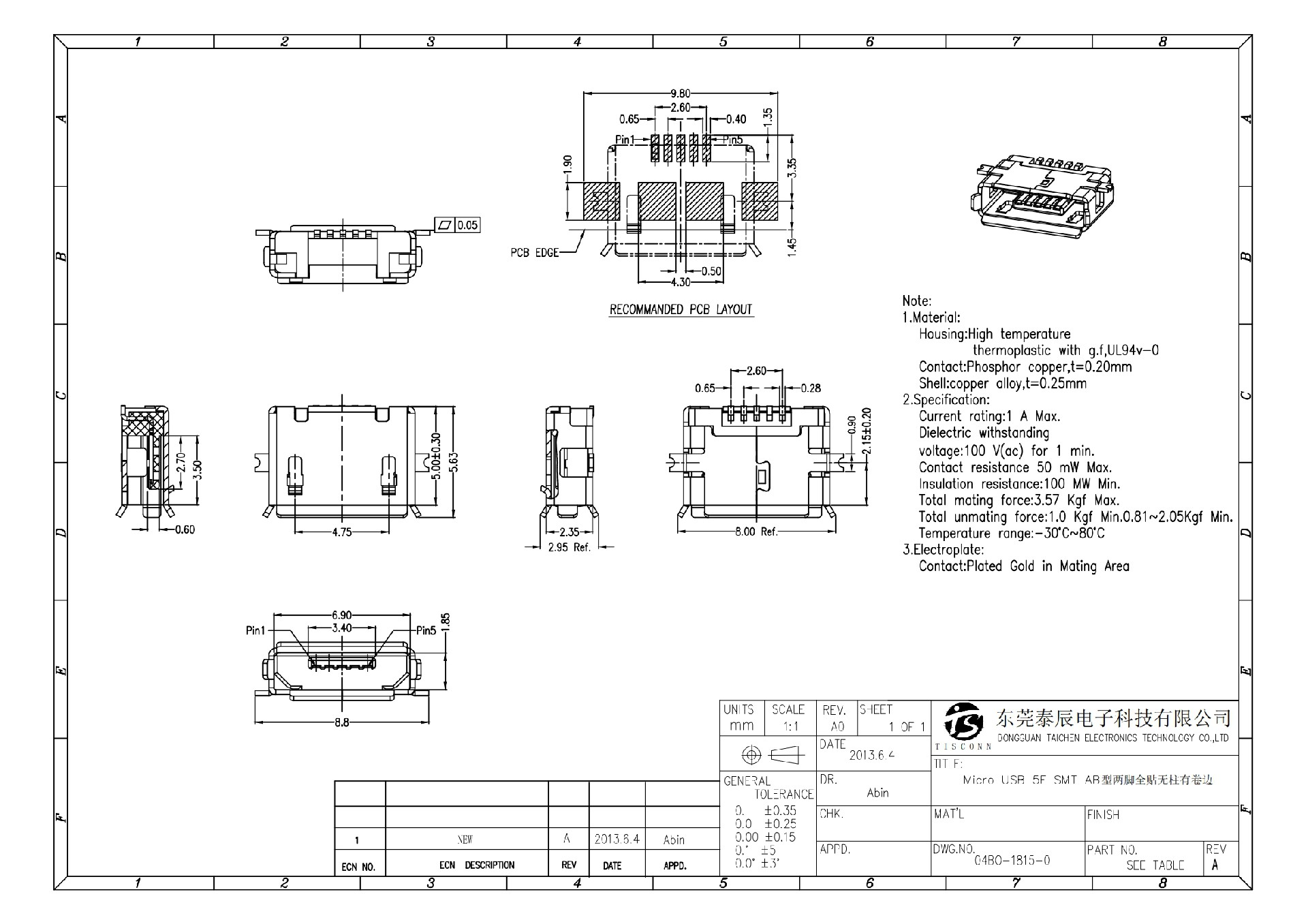 04BO-1815-0 Micro USB 5F SMT AB型兩腳全貼無柱有卷邊