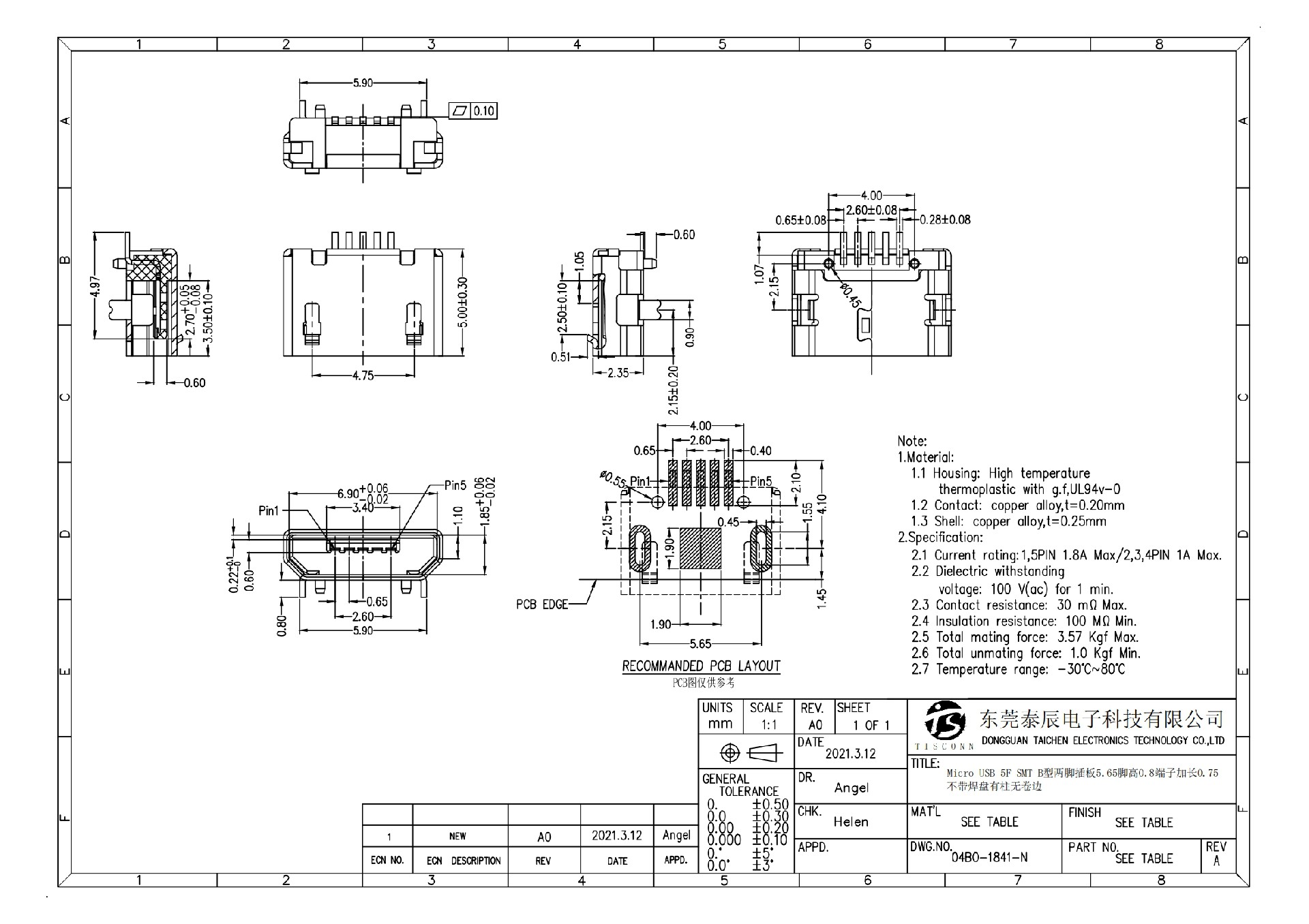 04BO-1841-N Micro USB 5F SMT B型兩腳插板5.65腳高0.8端子加長0.75不帶焊盤有柱無卷邊