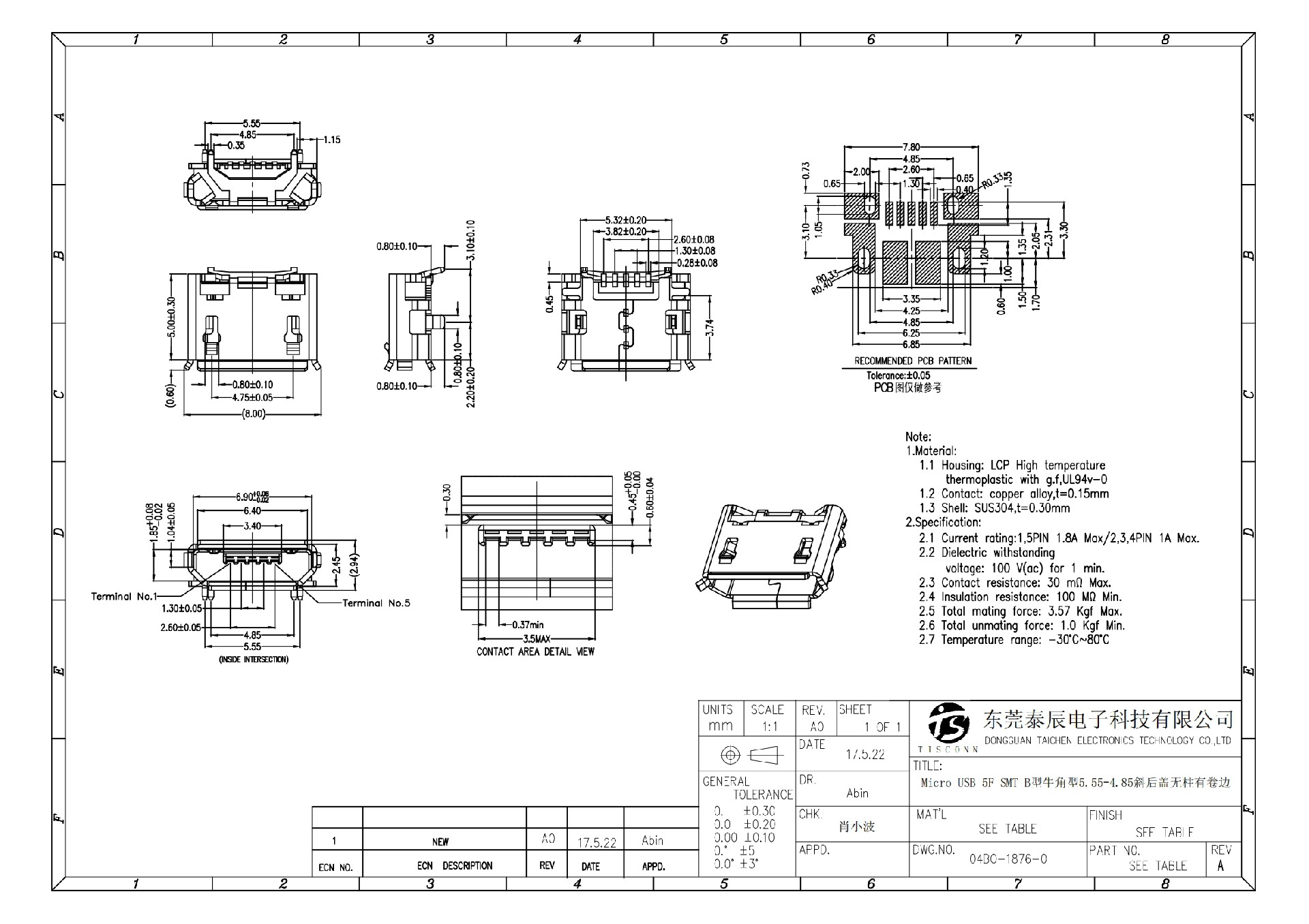 04BO-1876-0 Micro USB 5F SMT B型牛角型5.55-4.85斜后蓋無柱有卷邊