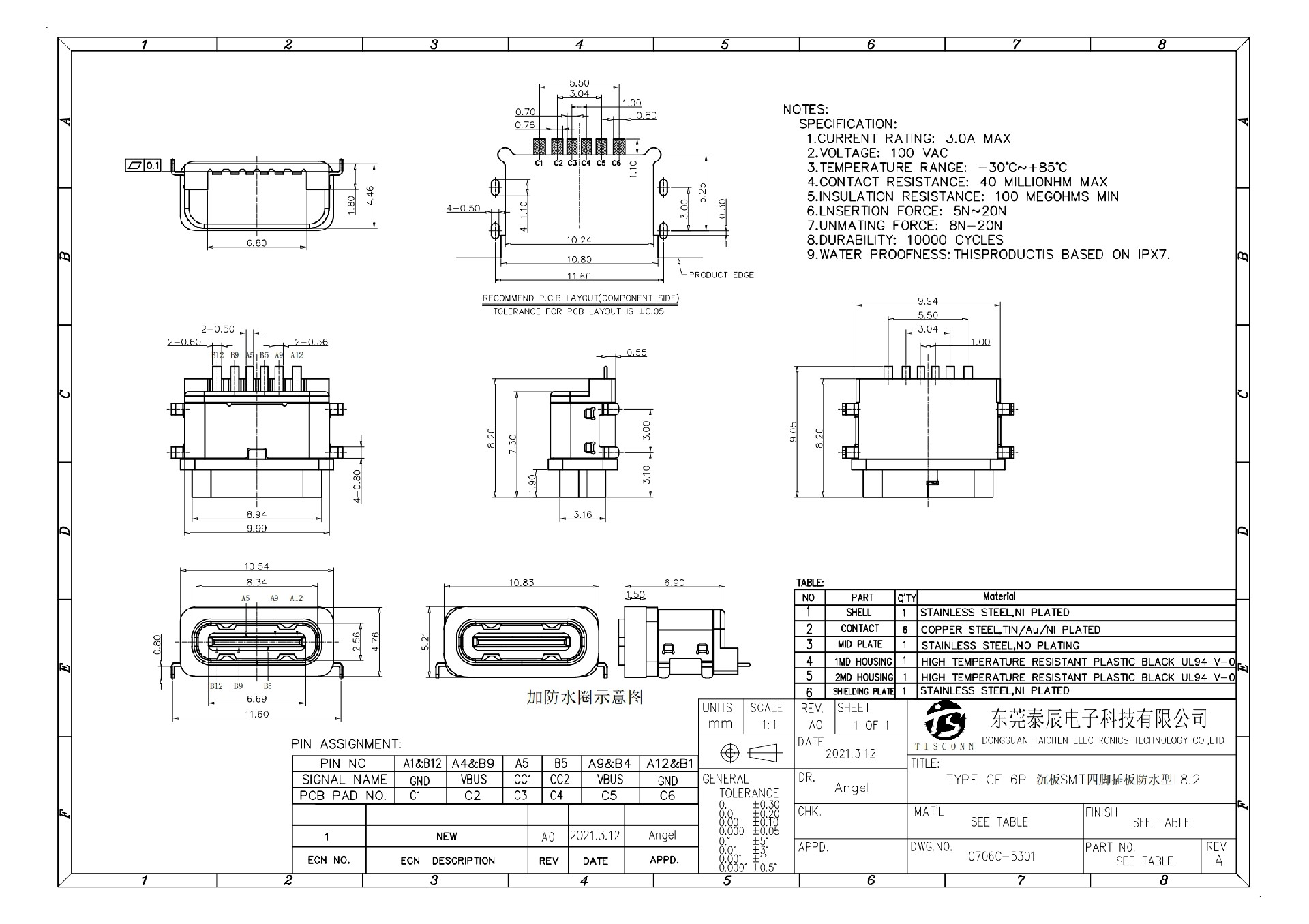 0706C-45A6-WP TYPE CF 6P SMT 90度四腳沉板防水母座 L=8.20 沉板0.8 IPX7