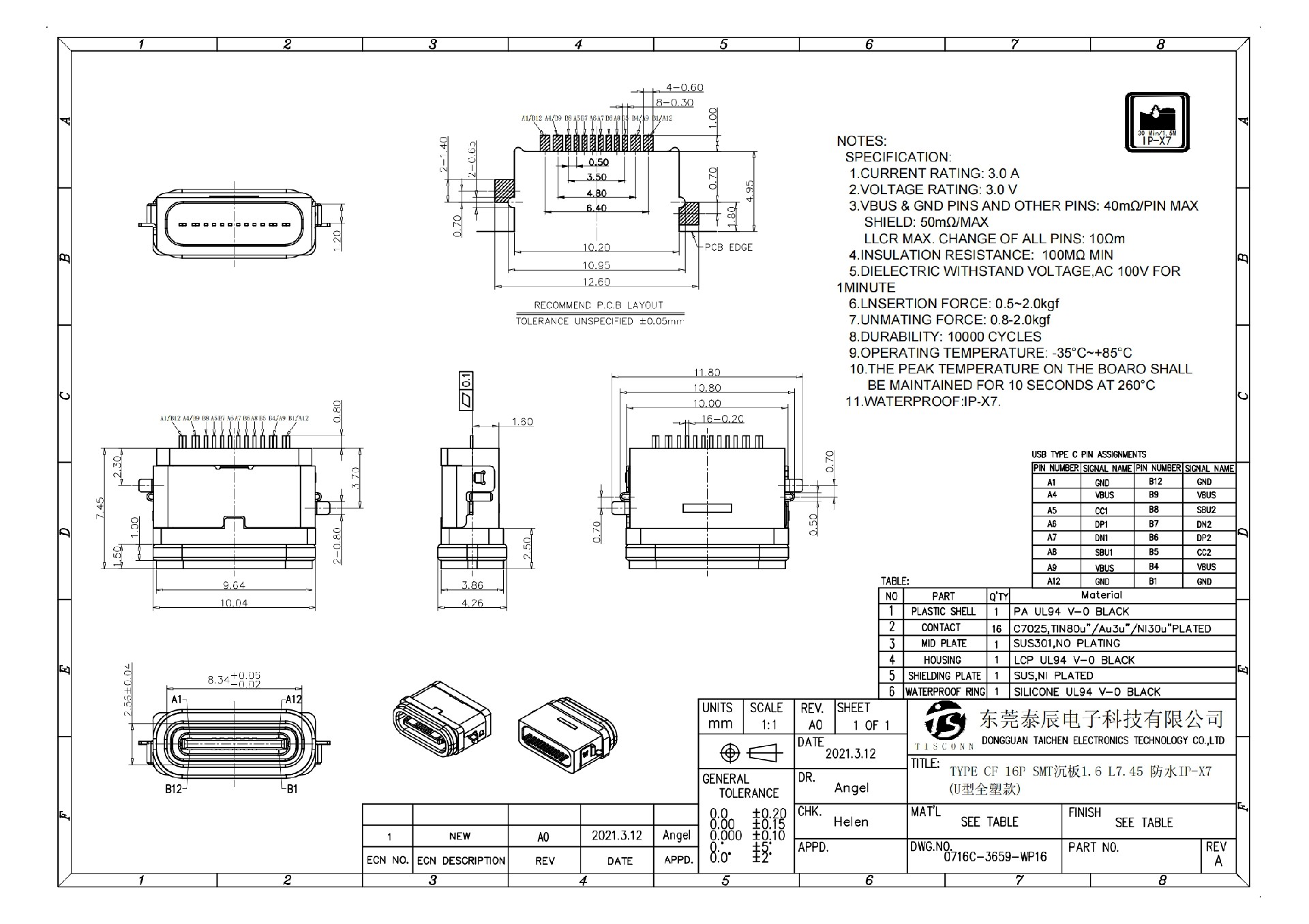 0716C-3659-WP16 TYPE CF 16P SMT沉板1.6 L7.45 防水IP-X7(U型全塑款)