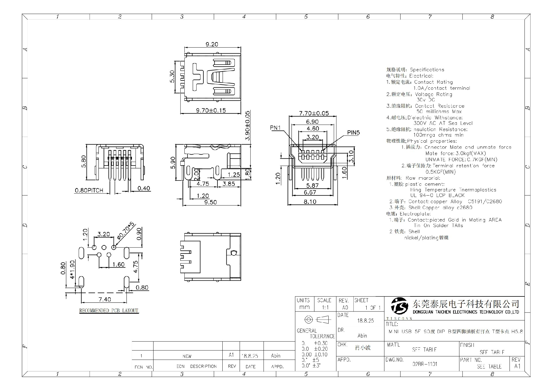 02BR-1101 MINI USB 5F 90度 DIP B型四腳插板有打點 T型卡點 H5.8