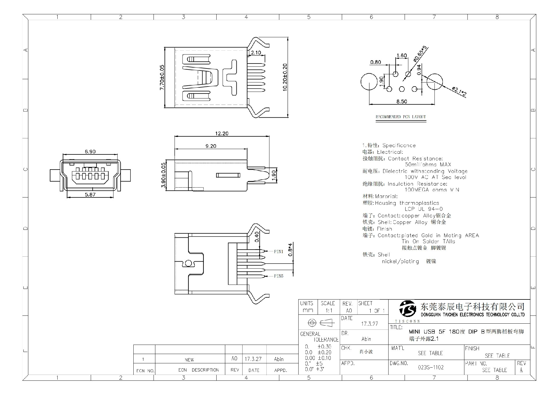 02BS-1102 MINI USB 5F 180度 DIP B型兩腳插板彎腳端子外露2.1