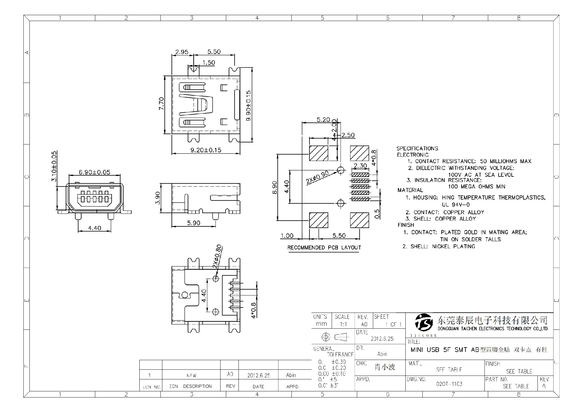 02OT-1103 MINI USB 5F SMT AB型四腳全貼 雙卡點(diǎn) 有柱