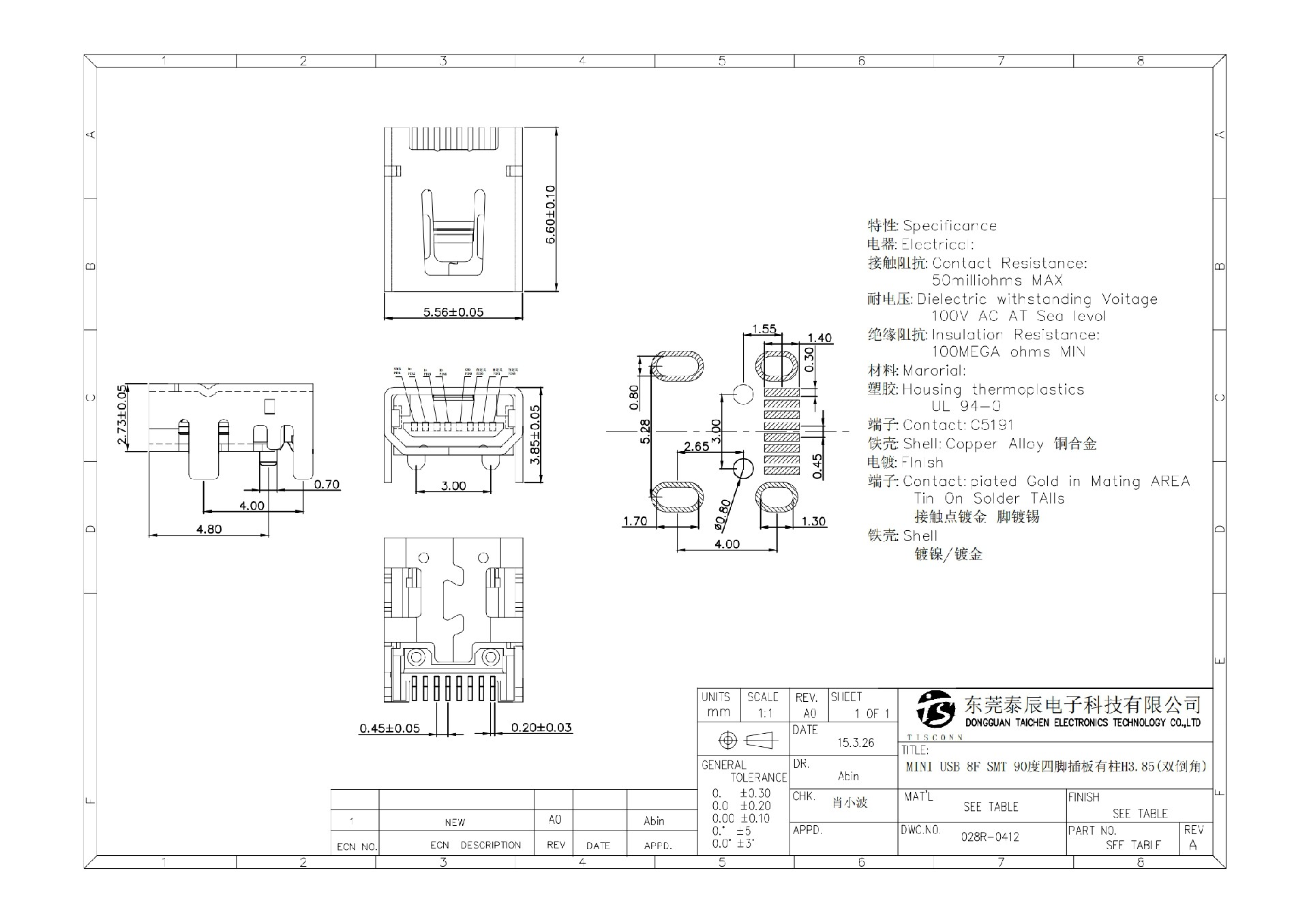 028R-0412 MINI USB 8F SMT 90度四腳插板有柱H3.85(雙倒角)