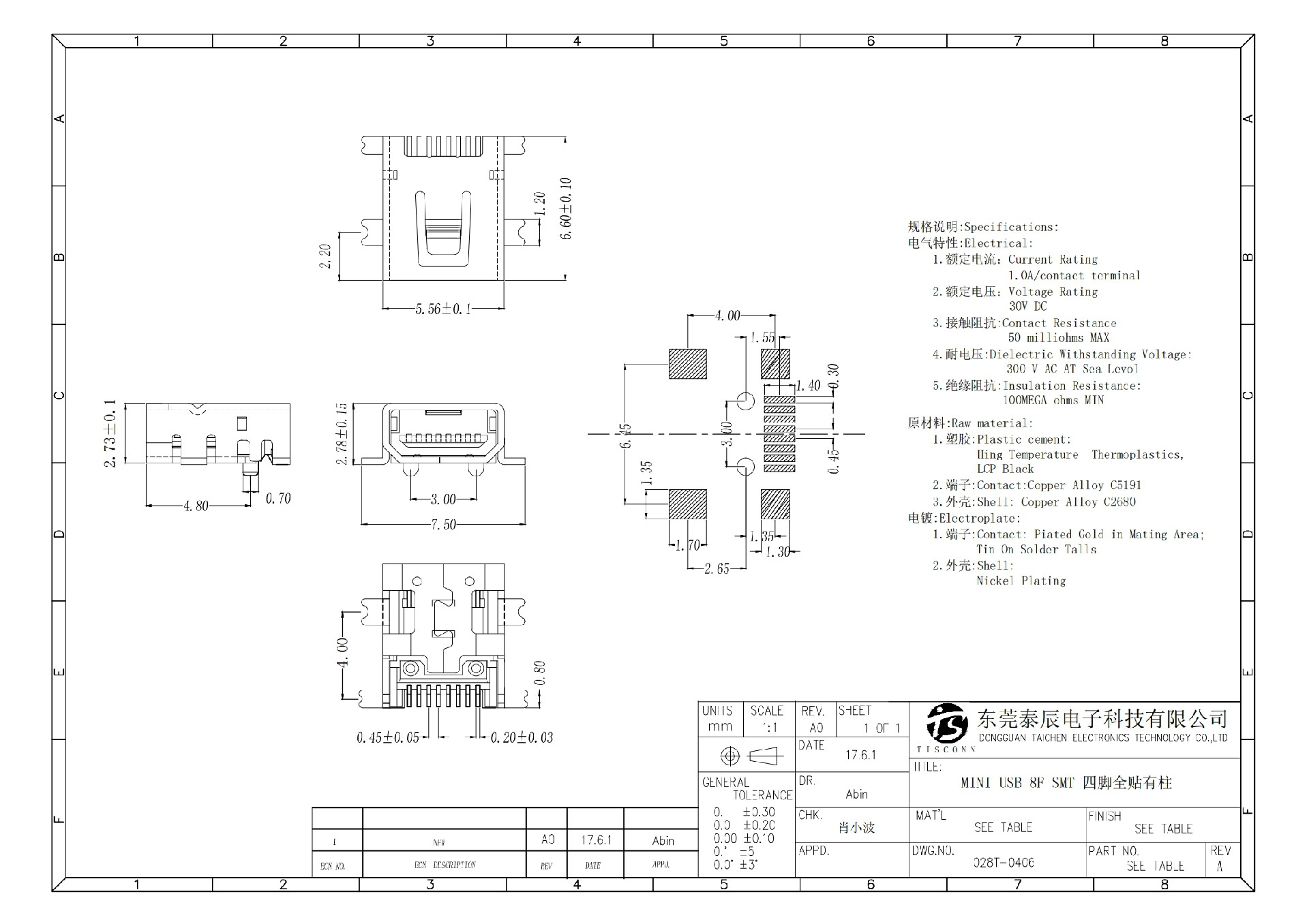 028T-0406 MINI USB 8F SMT 四腳全貼有柱