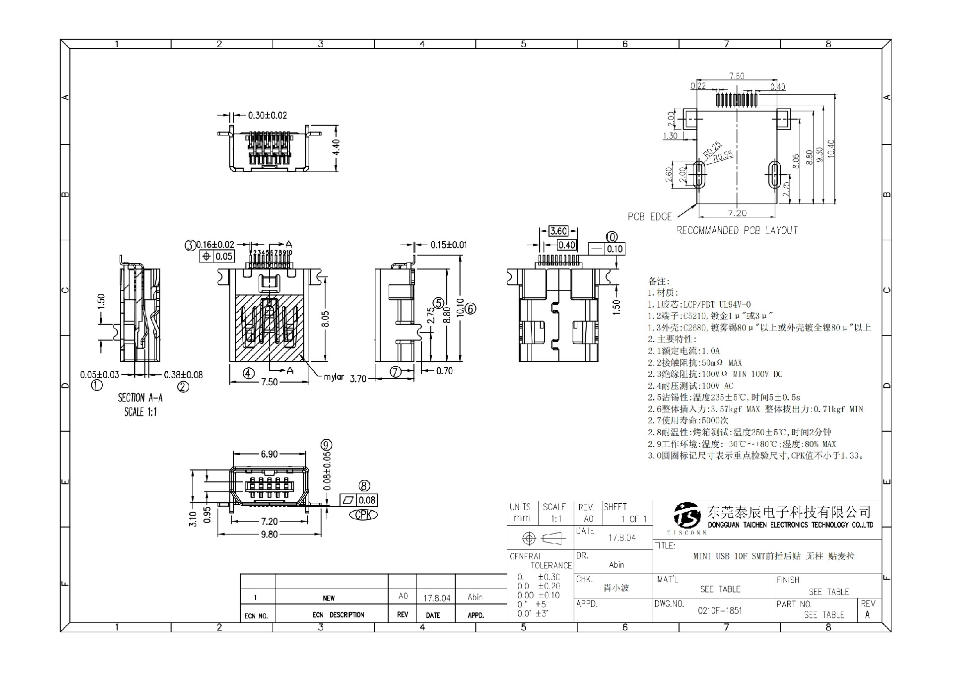 0210F-1851 MINI USB 10F SMT前插后貼 無柱 貼麥拉