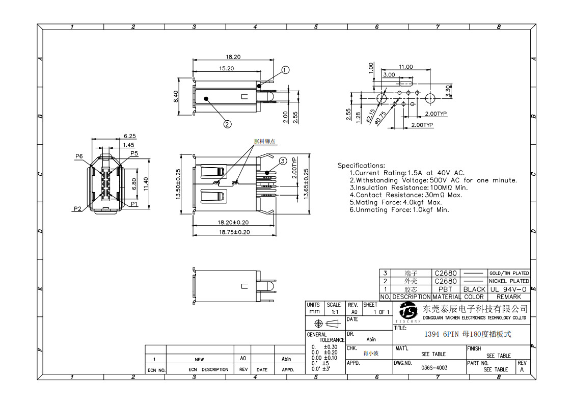 036S-4003 IEEE1394 6PIN 母180度插板式