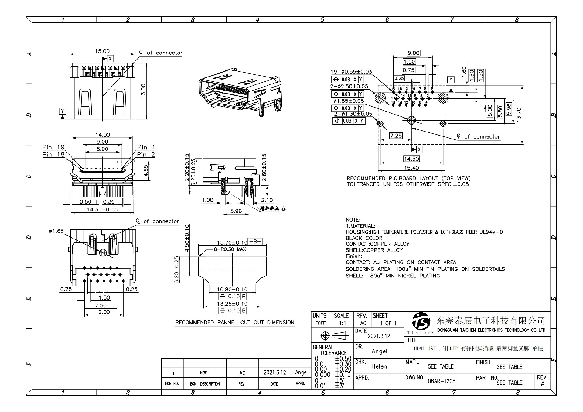 08AR-1208 HDMI 19F 三排DIP 有彈四腳插板 后兩腳魚叉腳 單柱