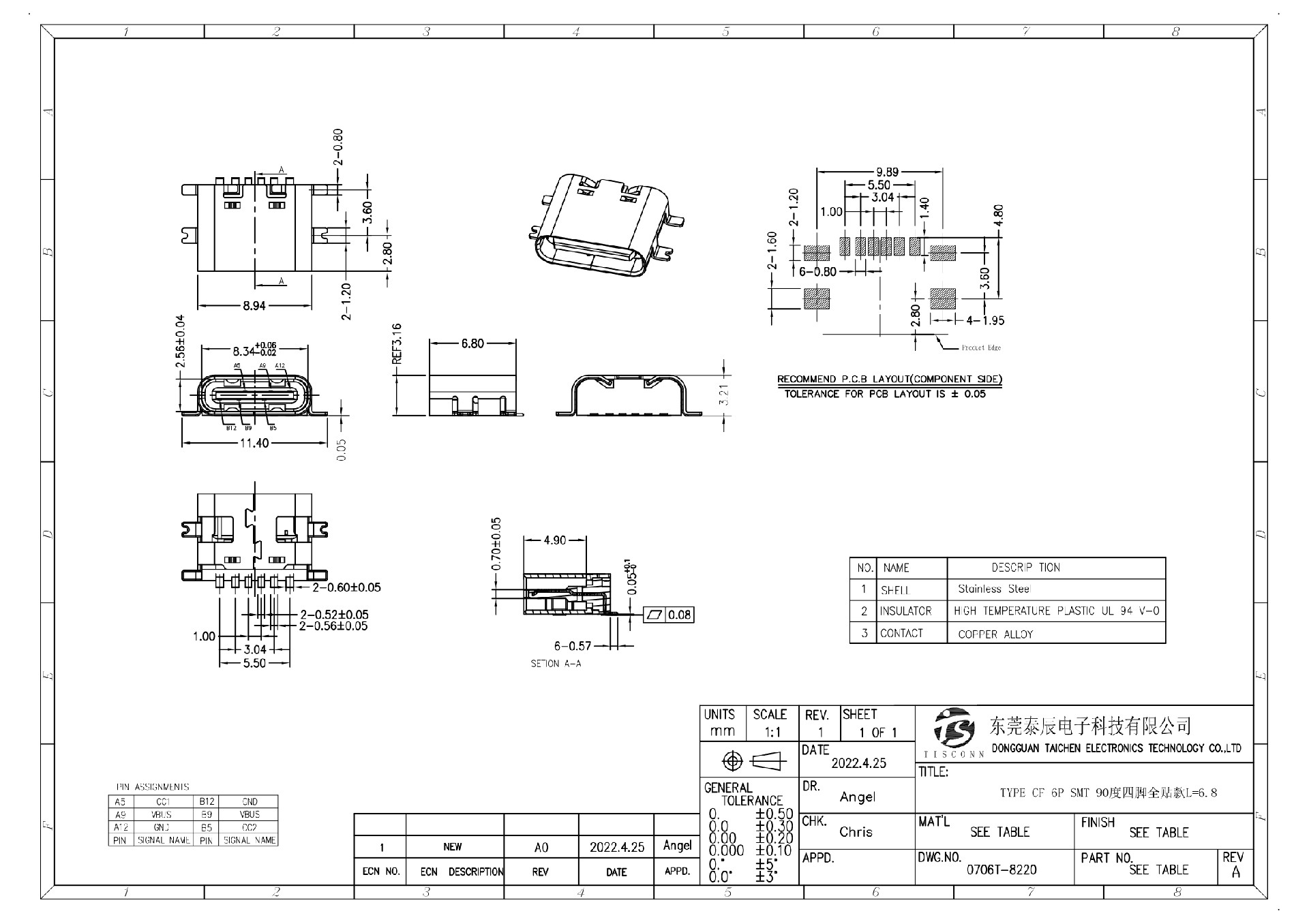 0706T-8220 TYPE CF 6P SMT 90度四腳全貼款L=6.8