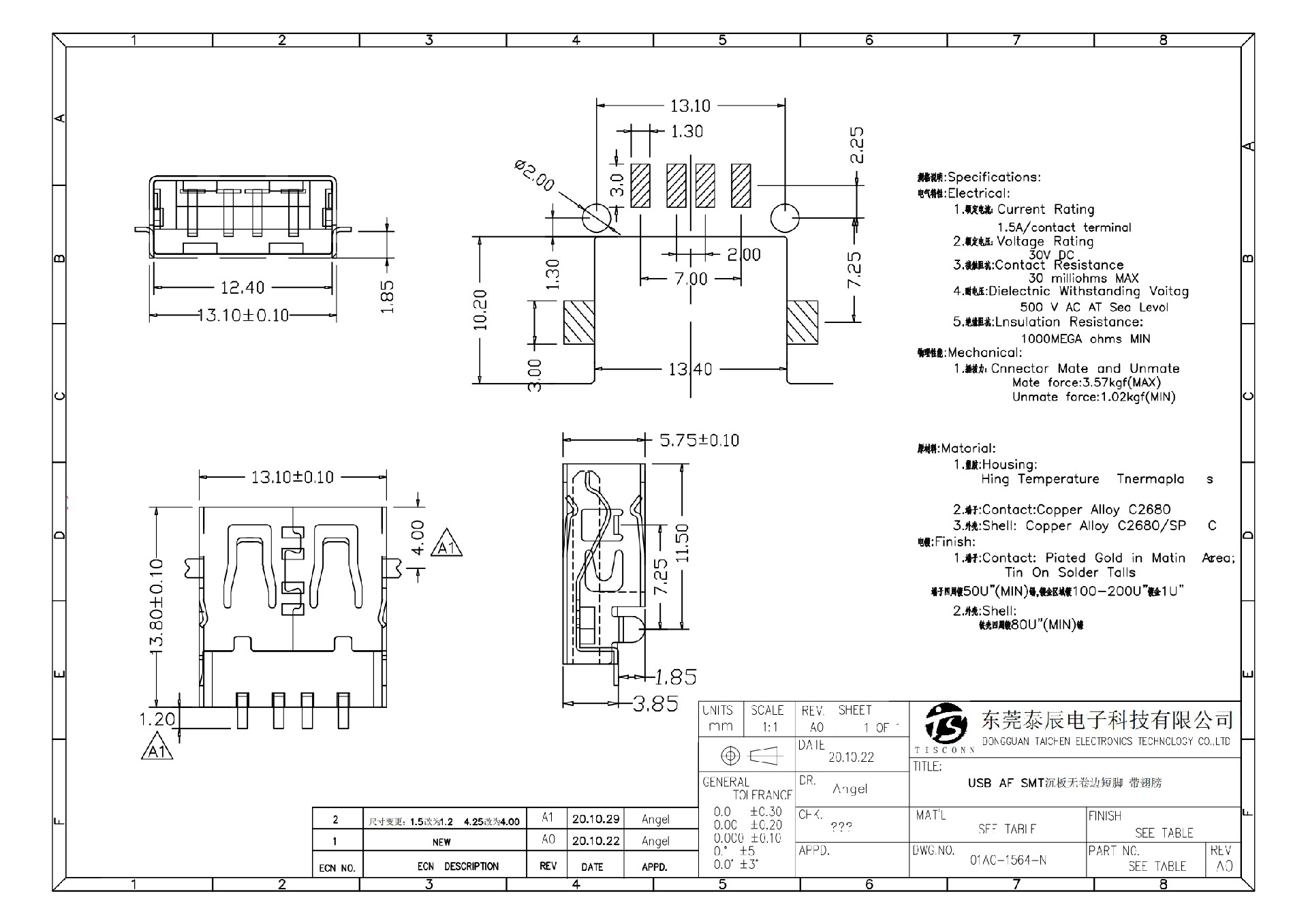 01AC-1564-N USB AF SMT沉板無卷邊短腳 帶翅膀