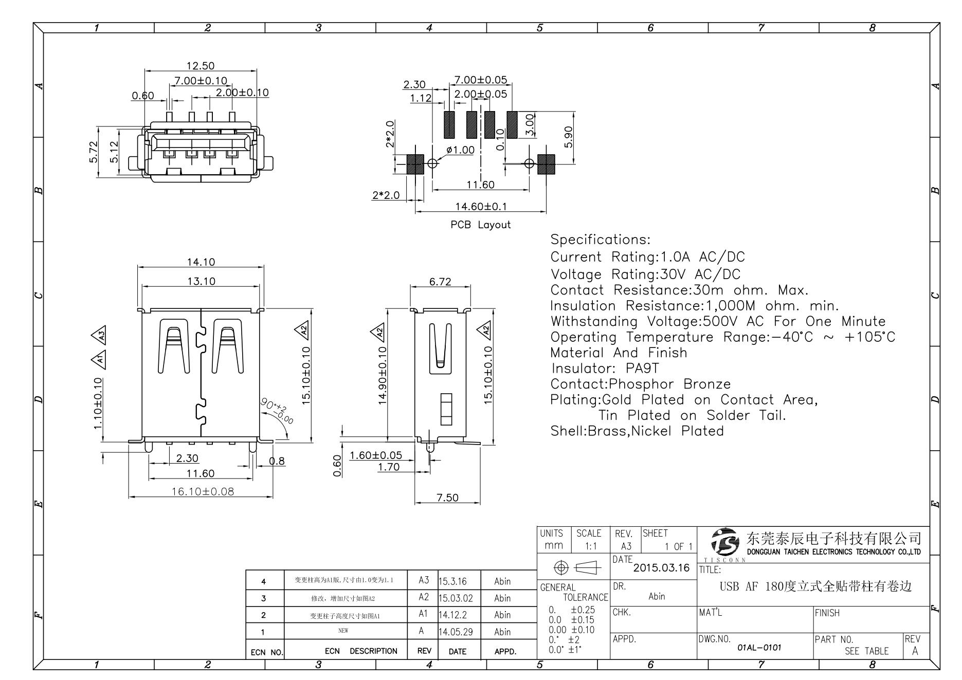 01AL-0101 USB AF SMT 180度立式全貼帶柱有卷邊