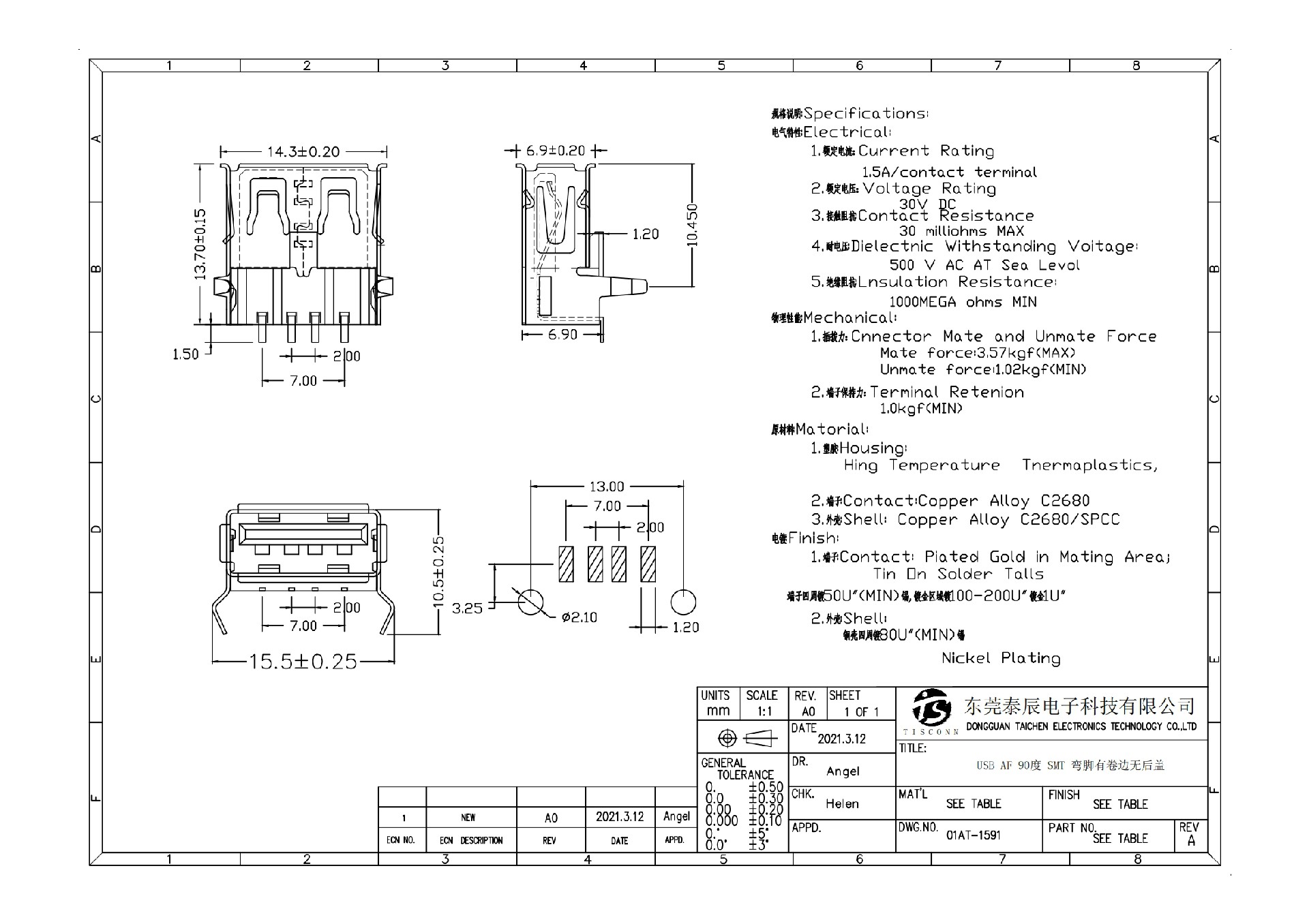 01AT-1591 USB AF 90度 SMT 彎腳有卷邊無(wú)后蓋