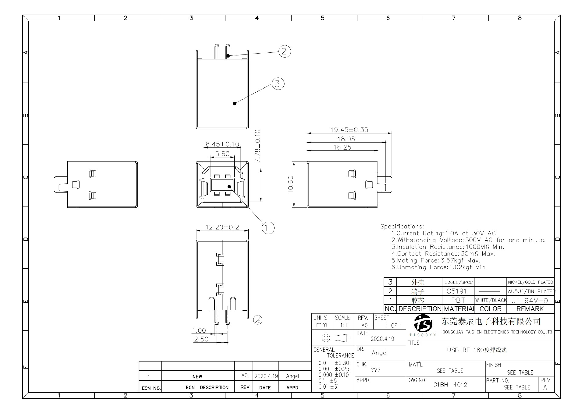 01BH-4012 USB BF 180度焊線式