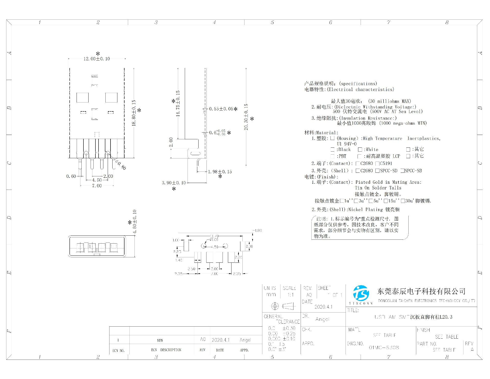 01MC-6308 USB AM SMT 沉板直腳有柱L20.3
